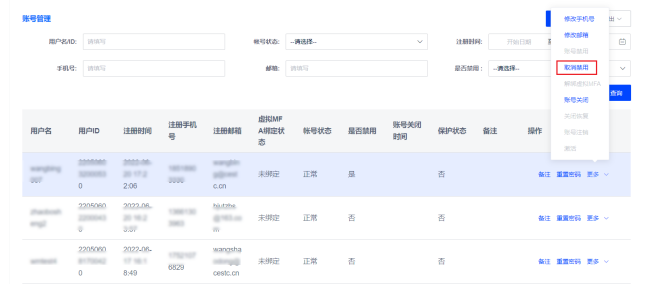 (4) 选择要禁用的账号,单击操作列的“更多 > 账号禁用”,弹出账号禁用确认窗口,单击“确定”之后,该账号被禁用。