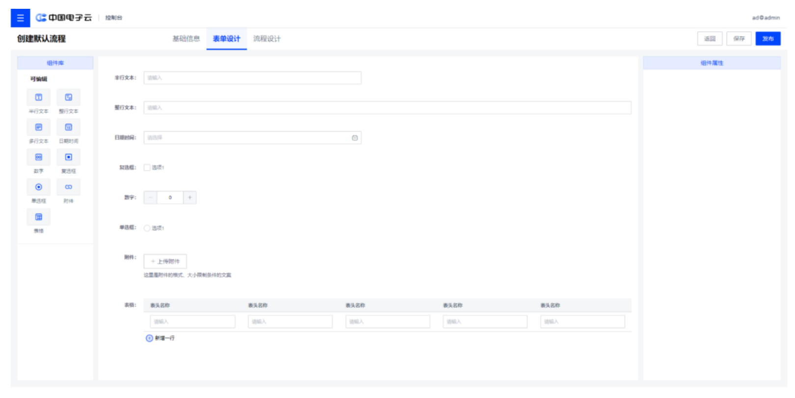 (6) 单击页面中的“表单设计”页签,进入默认流程表单设计页面,管理员可按照实际业务场景自定义流程表单,从左侧“组件库”中拖拽系统提供的通用表单组件至页面中间编辑区域即可进行详细配置,每个组件均需设置“组件名称”和“输入规则”。组件的具体规则如下: