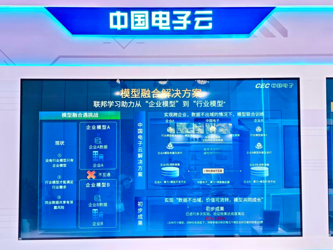 作为中国信创云先行者、中国电子集团计算体系的核心组成部分,中国电子云随集团亮相本次大会,系统展示其在人工智能领域的战略落地成果。重点展示新星·全链路AI解决方案,以多模态数据治理平台为底座,提供模型开发和应用开发平台,支撑人工智能应用落地。另外,针对单一企业数据不足、跨企业数据共享难的行业痛点,中国电子云创新推出跨企业、数据不出域的模型联合训练方案,在保障各参与方数据主权与安全的前提下,充分释放数据要素潜能,推动产业级AI模型的协同共建与价值安全流转,为央企、科研、医疗等重点行业数字化转型提供关键基础设施支撑。