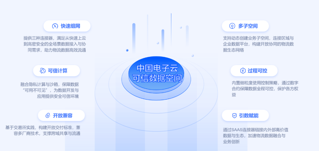 中国电子云可信数据空间平台以“安全、开放、易用、可控”为核心,具备六大关键能力: