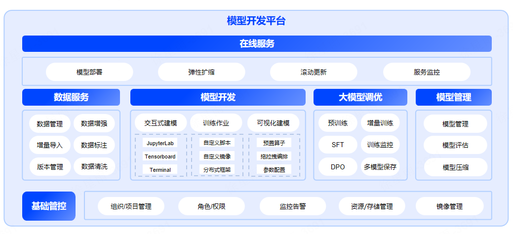 其中,模型开发平台是面向关键行业客户打造的全链路开发平台。平台内置丰富的大小模型,提供高效灵活的开发工具与稳定可靠的推理服务,并构建了安全可控的保障体系,为客户快速构建AI能力提供了工具支撑。