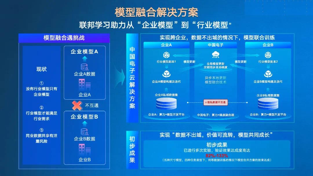 中国电子云已实现技术突破,打造出一套模型融合方案:通过联邦学习技术,在本地完成企业模型训练,仅全局更新模型梯度,从而实现在各企业数据不出域的前提下,联合训练出行业大模型。简言之,该方案可在保障A企业和B企业数据安全不出域的情况下,由中国电子云作为第三方进行模型融合,提取两家数据中蕴含的知识,训练出一个新的行业大模型,实现知识共享。经测试,融合模型的效果可达直接合并数据训练模型的80%,在某些场景下甚至提升至1.3倍。这为拉通产业链上下游、实现知识共享提供了可行路径。目前,该方案已在不同参数量模型、不同训练任务、不同数据集上多次验证,效果良好。